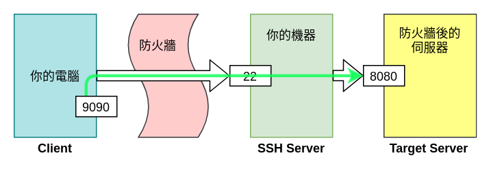 ssh -L 0.0.0.0:9090:localhost:8080 johnliu@my-server使用情境二:透過防火牆後的機器,連到防火牆後的特定服務
