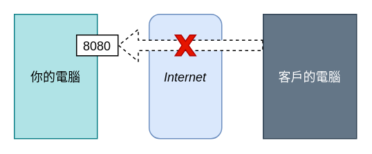 你在你的電腦上開發完了一個服務架在 Port 8080 上,然後你想要 Demo 給客戶看,但你的電腦只有內部 IP,所以無法讓客戶連進來: