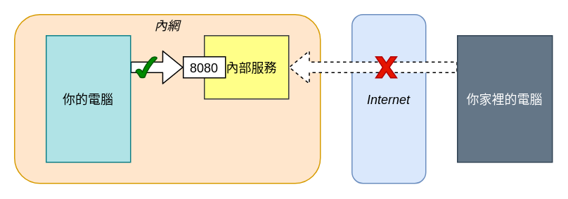 有一個在內網裡的內部服務,你的電腦可以用 IP 192.168.1.100 和 Port 8080 連到這個服務,但因為都在內網所以大家都沒有 Internet IP,所以無法讓你從家裡透過 Internet 連回來: