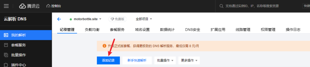 以腾讯云为例,前往云解析DNS,我的解析,选择添加记录