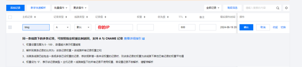 也可以添加整个子域名范围,这样Caddy应用子域名的时候就不用再来添加了,例如添加*.blog,一样指向你的服务器IP。这样你就可以在Caddy添加多个子域名来对应多个服务,例如aaa, bbb, ccc: