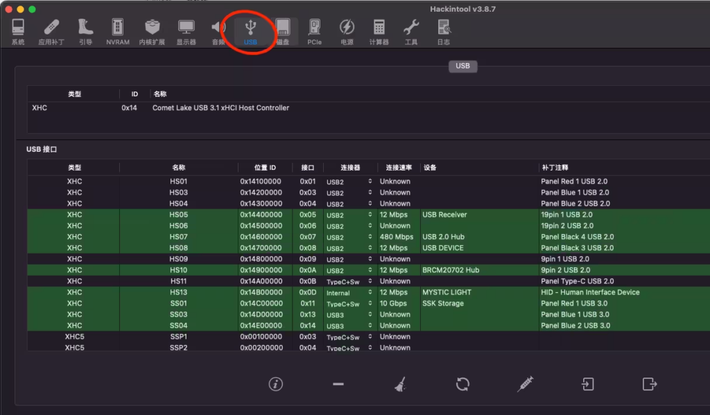 操作很简单,首先如果你已经驱动原有的无线网卡,则需要去oc的kext列表将原有的网卡驱动禁用或删除。随后,使用hackintools查看原网卡对应的usb接口名称,我这边是HS14,图里因为已经被屏蔽了所以没有显示,每个电脑都不同,需要你自己去查看。