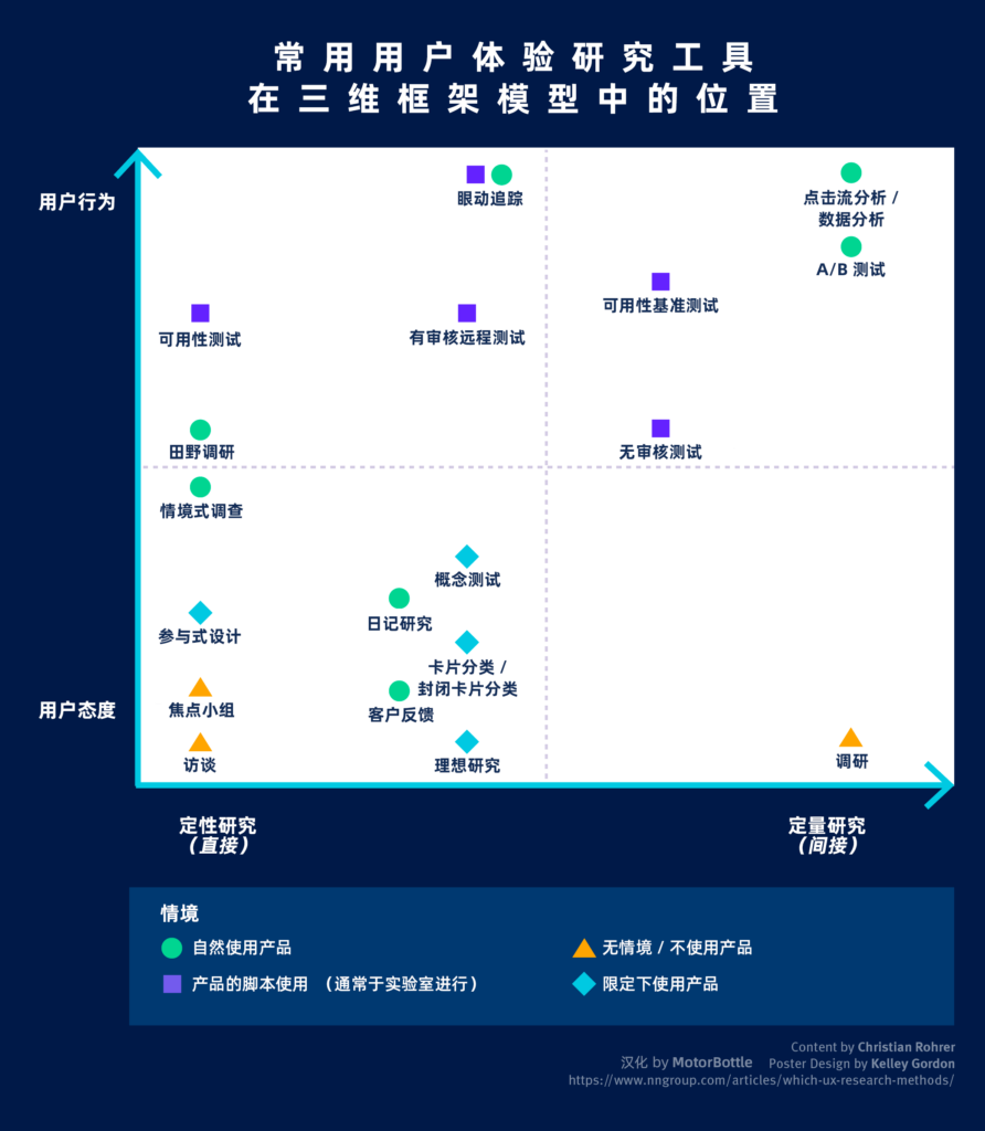 用户体验研究有多种不同工具可供选择。一套可视化的三维框架可以帮助我们更好地理解何时采用哪一种工具,三个维度分别是: