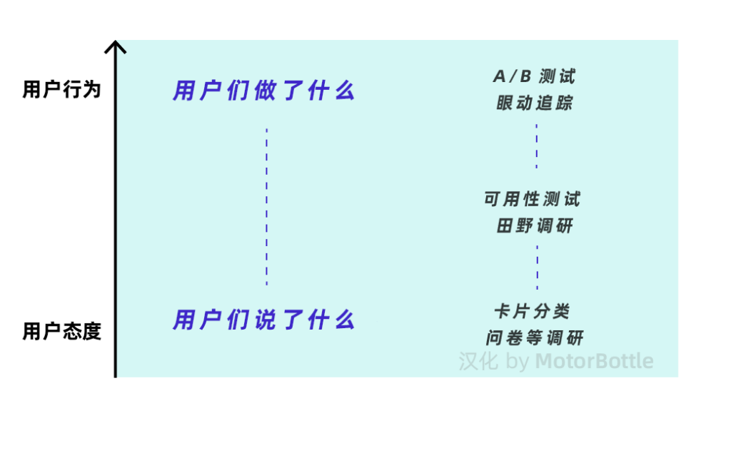 两者的区别概括的来说可以总结为**“用户说了什么”以及“用户是怎么做的”**(两者往往会大相径庭)。而除了两头侧重性非常强的工具,还有处于中间我们最常用的两个工具:可用性测试和田野调研。这两项工具都能兼顾利用户的主动表达以及他们行为表现的数据。